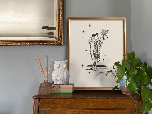 Garden Witch Ink Illustration: Cottagecore Halloween Art Print